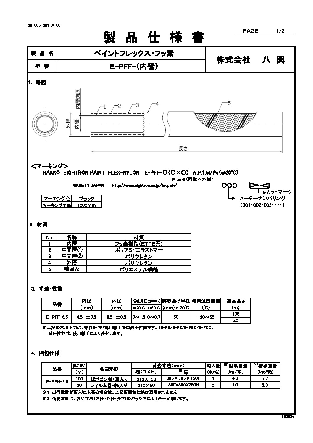 ●耐溶剤性…内層は4フッ化系フッ素樹脂(ETFE系)のため、塗料、有機溶剤、シンナー等に優れた耐薬品性を有します。