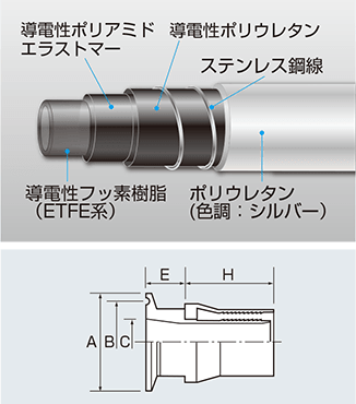 ●導電性樹脂とステンレス線とのハイブリットシステムで、ホースが長くても導電性(消散性)等級を実現します。