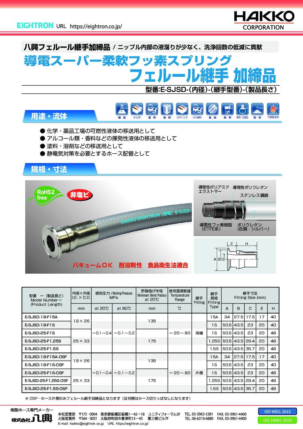●ホース内層が4フッ化系フッ素樹脂(ETFE系)のため、優れた耐溶剤性、耐薬品性を有します。