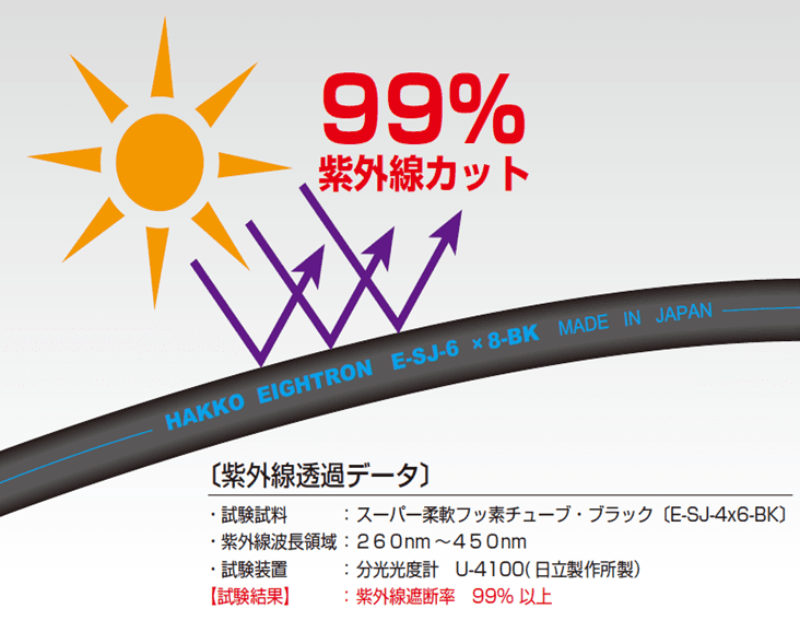 八興のスーパー柔軟フッ素チューブ・ブラック〔E-SJ-BK〕なら、内層のフッ素樹脂〔ETFE系〕が耐溶剤性があり外層の遮光性ウレタン樹脂が紫外線、可視光線を99%以上カットできるため、UV塗料がチューブの中で硬化することなく、安定した流体の搬送が可能になります。